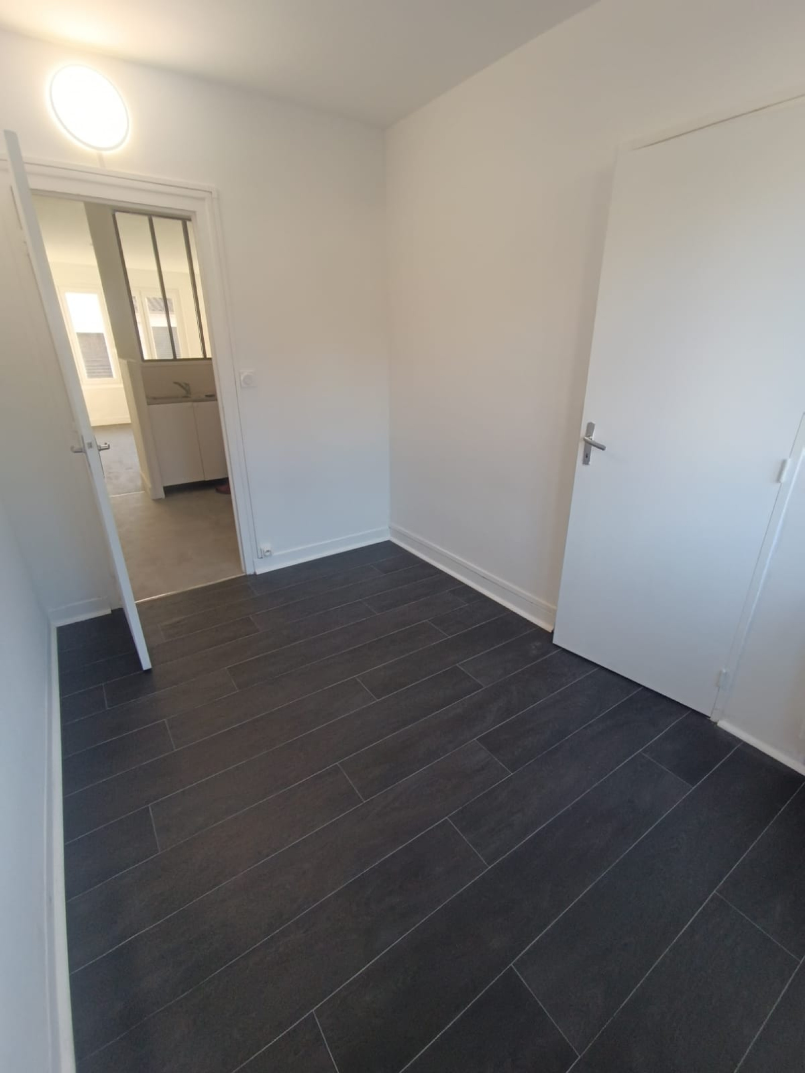 Ce logement traversant, rénové en 2024, se compose d'une entrée distribuant la cuisine aménagée ouverte avec une verrière type atelier sur la pièce de séjour orientée au sud d'une part, et d'un espace de nuit avec salle d'eau attenante d'autre part.