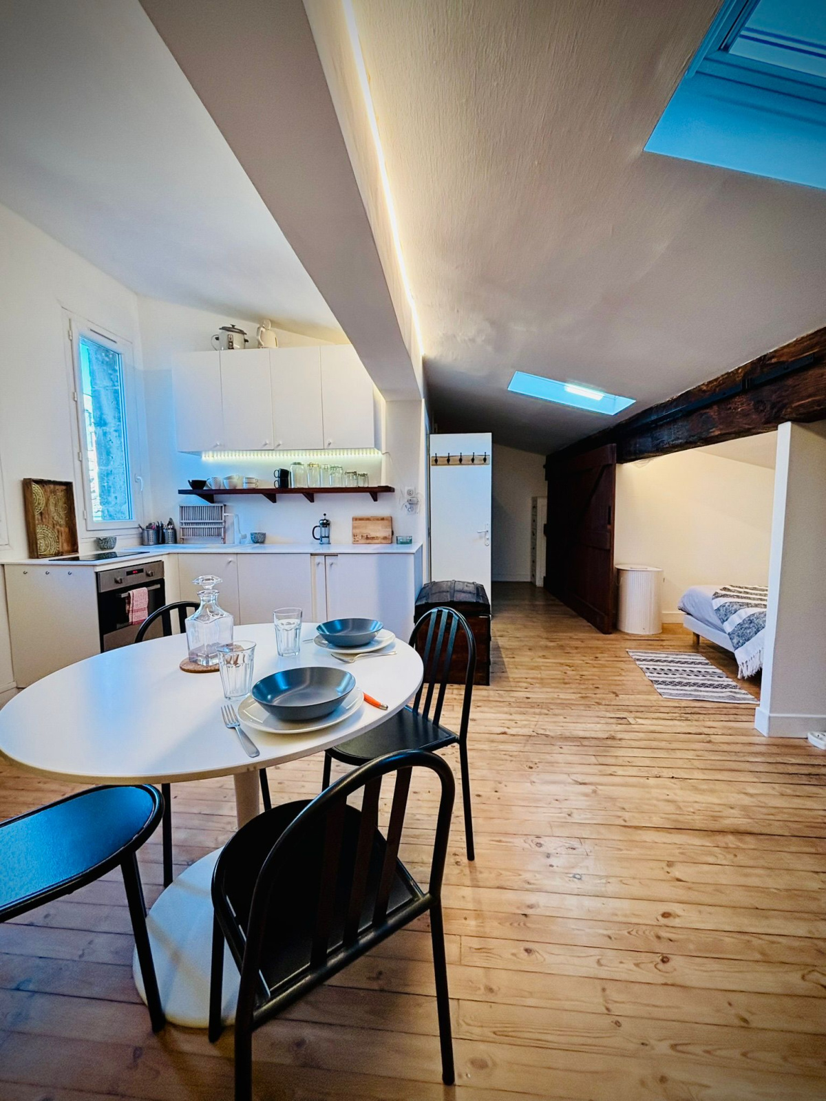Cet agréable logement comprend une entrée qui donne accès à la pièce principale de plus de 24m2 avec cuisine ouverte équipée, espaces de nuit et pour les repas. Nous avons également des toilettes séparés et une salle d'eau.