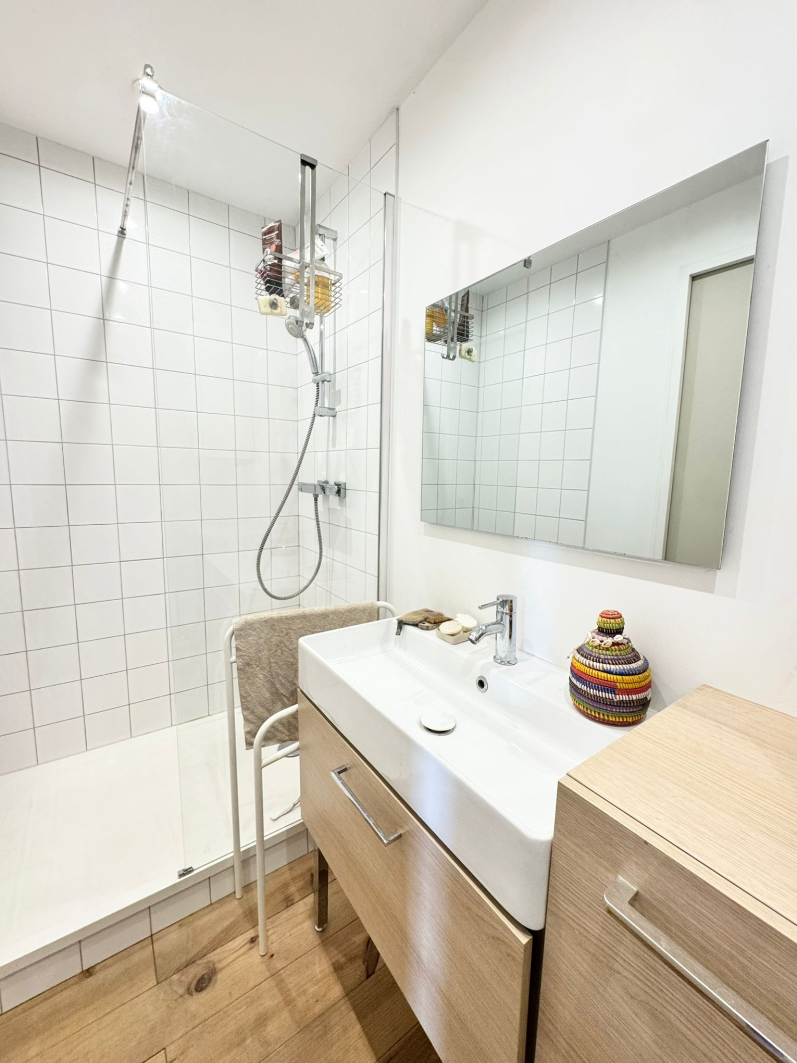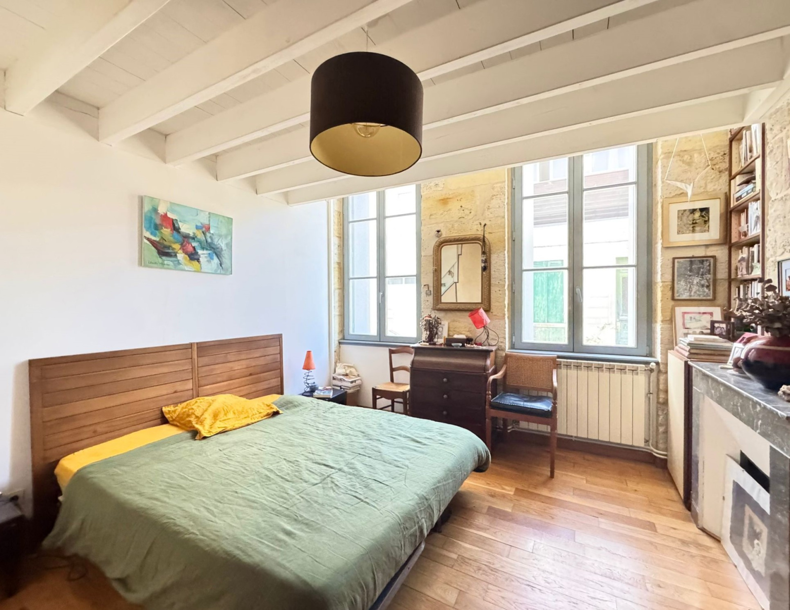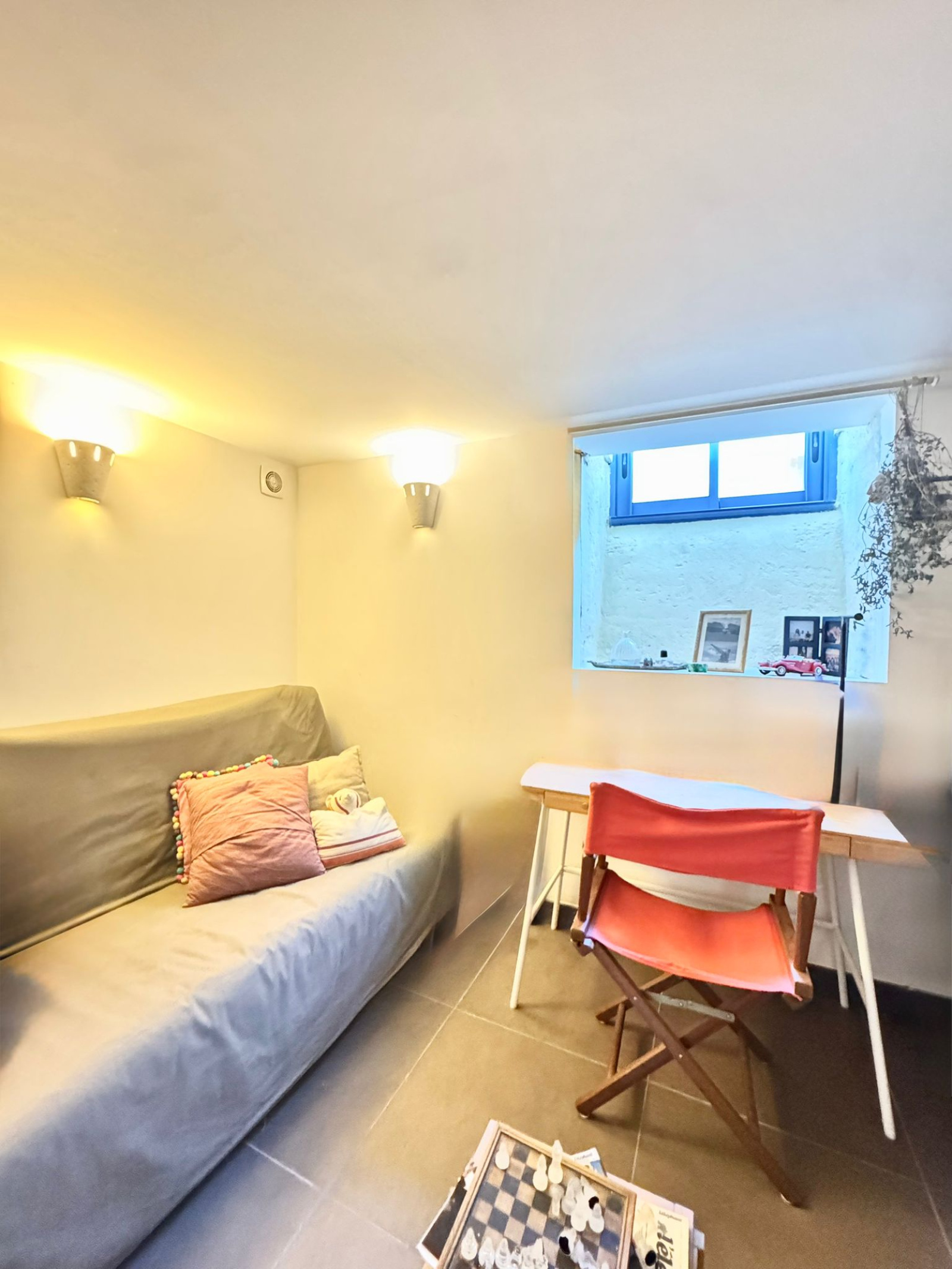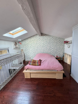La maison propose une chambre de plain-pied de 15 m² avec rangements sur mesure, ainsi qu’une salle d’eau équipée d’une douche à l’italienne. À l’étage, deux chambres complètent l’espace nuit. L’une d’elles, côté jardin, est issue d’une extension récente réalisée par un architecte, apportant un volume supplémentaire et une belle luminosité, avec sa salle d’eau attenante.