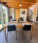 L’entrée mène à un séjour lumineux, agrémenté d’une cheminée décorative qui apporte une touche chaleureuse à la pièce. Dans son prolongement, la cuisine s’intègre naturellement à l’espace de vie, créant une belle fluidité entre les volumes. Spacieuse et contemporaine, elle développe plus de 20 m² et se distingue par son sol en béton ciré. De grandes baies vitrées permettent une ouverture sur le jardin arboré d’environ 100 m² orienté Sud-Est, renforçant la continuité entre intérieur et extérieur et offrant un cadre de vie particulièrement plaisant.